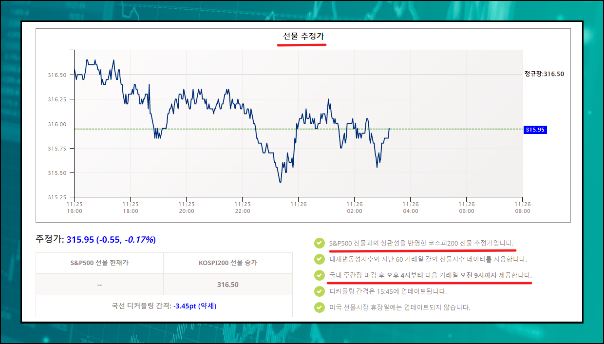 개인적으로 저는 야간선물지수와 함께 위와 같은 "추정가" 메뉴를 함께 봅니다. 이는 s&p 500과 상관성을 반영한 코스피 200 추청가 인데요. 해당 사이트에서 만든 프로그램에서 분석한 결과로 생각보다 잘 맞습니다. 다음날 코스피 시가를 예측하는데 큰 도움이 돼요.