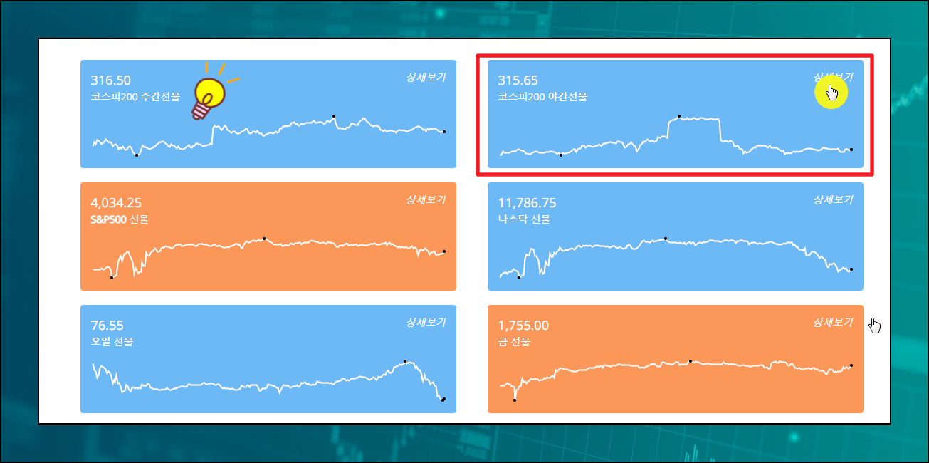 간단하게 인터넷 사이트에 접속하여 코스피 야간선물지수를 실시간으로 확인할 수 있습니다. 사상최강 사이트에 접속해 주세요.