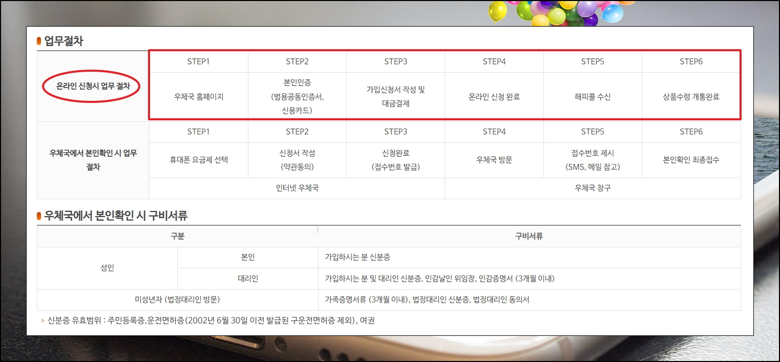 2가지 방법을 통해 가입이 가능합니다. 온라인 사이트를 이용하는 방법과 우체국에 방문을 하는 것입니다. 개인적으로 인터넷 사이트를 이용하는 것을 선호합니다. 우체국 방문 시 기다려야 하거나 일부 지점에서는 알뜰폰 서비스를 일시적으로 운영하지 않는 곳이 있을 수 있기 때문입니다. 그렇기 때문에 우체국 방문을 하기 전에 미리 연락을 해보는 것이 좋습니다.
