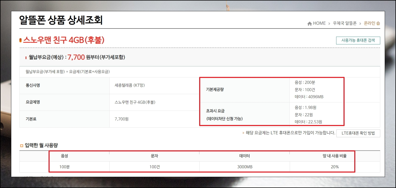 요금제 비교 사이트에서 제게 맞는 조건을 검색해 보았습니다. 기존에 대형 통신사에서 같은 조건으로 사용했을 때에는 3만원 정도 납부를 하고 있었는데, 해당 서비스 이용 시 월 7,700원만 내면 됩니다.