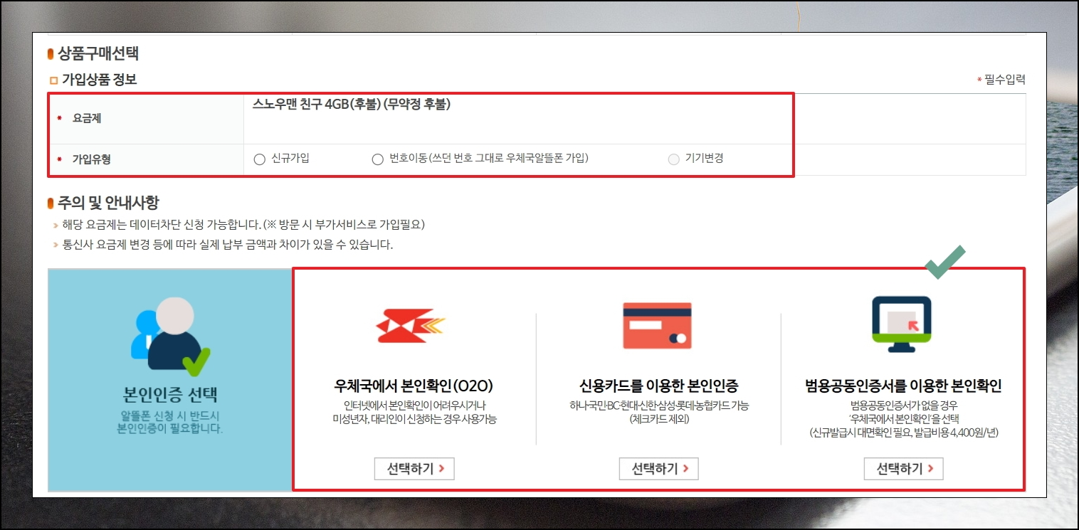 상세 페이지에서 화면을 좀 내려 보면 우리가 찾은 알뜰폰 요금제에 대한 가입 신청을 할 수 있는 영역이 나타납니다. 신규가입, 번호이동, 기기변경 모두 가능합니다. 온라인으로 진행을 할 때에는 O2O, 카드, 인증서를 이용한 본인 확인 절차를 거쳐야 합니다.