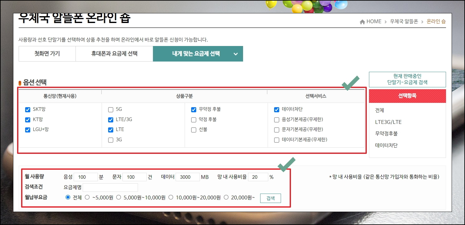 몇 가지 옵션과 조건을 선택하면 해당 조건에 맞는 요금제를 찾을 수 있습니다. 그 다음 직접 비교하고, 그 중에서 마음에 드는 것을 선택하면 됩니다. 일단 우체국 사이트에서 선택할 수 있는 옵션 중에서 추천하는 것은 "무약정 후불""데이터 차단" 옵션입니다. 약정이 없는 경우 언제든지 해지를 해도 되기 때문에 좋습니다. 무제한 데이터를 사용하는 경우가 아니라면 데이터 차단 기능이 있어야 추가 금액이 과하게 나오는 것을 방지할 수 있습니다. 옵션을 선택한 이후에는 본인의 음성, 문자, 데이터 월 사용량을 입력합니다.