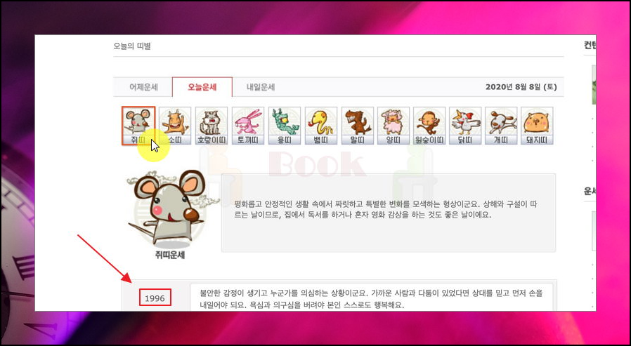 오늘의 띠별 운세를 이용하는 방법은 어렵지 않아요. 가장 먼저 해야 할 것은 날짜를 지정하는 일이에요. 어제, 오늘, 내일 이렇게 3가지 날짜에 들어오는 운을 알아볼 수 있어요. 띠별 운세를 보기에 앞서 자신이 어디에 해당하는지 알아야 하는데요. 간단하게 알 수 있는 방법이 있습니다. 아이콘을 클릭해 보세요. 그럼 풀이 아래에 연도가 표시되어 있어요. 이 표시를 통해 쉽게 파악이 가능합니다. 저는 쥐를 선택했는데요. 특별한 변화를 모색하는 형상이라고 하네요. 독서를 하거나 영화 감상을 하는 것이 좋다고 해요. 이런 식으로 운명을 알려주는 것과 함께 어떻게 하면 좋은지 알려주기도 해요.