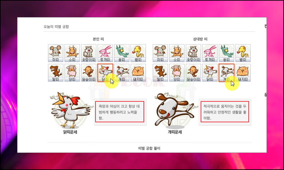 오늘띄 띠별 궁함도 무료로 볼 수 있어요. 좋아하는 사람이 있는 경우에 사용하면 좋은데요. 본인 띠와 상대방의 띠를 선택해 주세요. 그럼 띠별 성격을 확인할 수 있어요.