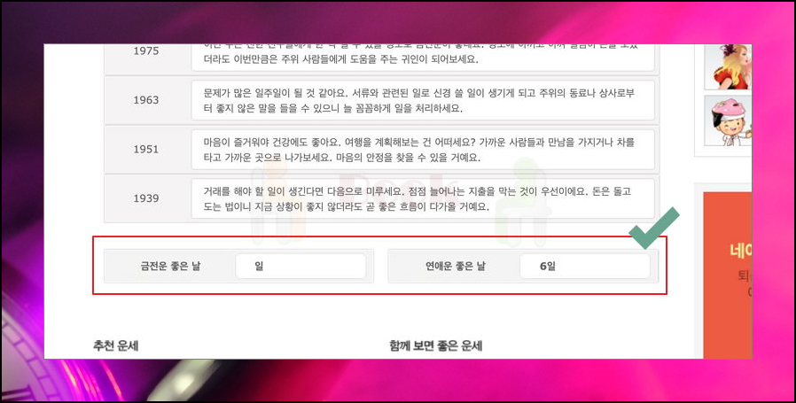 주간 띠별운세 서비스의 경우에도 태어난 연도에 따라 다른 풀이를 제공하고 있고요. 금전운이 좋은 날과, 연애운이 좋은 날을 알려주기 때문에 계획을 세울 때 참고하기 좋아요.