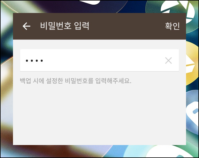 백업용 비밀번호를 따로 설정합니다. 현재 사용하는 카톡 아이디에 대한 비밀번호와는 같아도 되고 달라도 됩니다. 해당 비밀번호를 잊어버리는 경우에는 다시 복원을 하기 어렵습니다. 그러므로 잘 잊지 않는 번호를 사용하던가 따로 적어 놓는 것이 좋습니다.