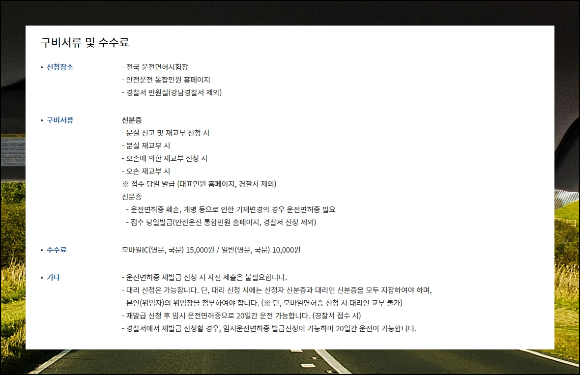 인터넷이 아닌 방문을 통해 분실 재발급 진행을 하고 싶은 분들이 계실 텐데요. 그런 경우에는 시험장이나 경찰서 민원실에서 신청하시면 됩니다. 신분증을 꼭 지참하셔야 하고요. 10,000원의 수수료가 발생한다는 점을 꼭 기억해 주세요. 기본적으로 운전면허증 재발급 신청을 할 때에는 사진을 제출할 필요가 없습니다.
