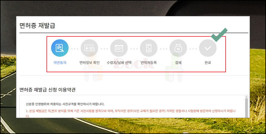 운전면허증 분실 재발급은 총 6단계로 진행되는데요. 약관동의, 정보 확인, 수령지 및 수령 날짜 선택, 당사자 연락처 등록, 수수료 결제, 완료 입니다. 기본적으로 분실 재발급을 할 때에는 기존 사진사용을 원칙으로 해요. 부득이하게 사진을 교체하고 싶으신 분들은 온라인 서비스가 아닌 가까운 경찰서나 시험장에 방문 신청을 하셔야 합니다.