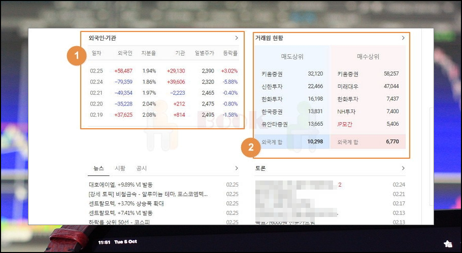 8. 투자 주체별 거래 현황을 조회해요. 주식시세 조회를 할 때 외국인, 기관, 개미가 얼마나 투자하는지 참고하기도 하는데요. 거래원과 함께 이러한 부분을 쉽게 조회할 수 있어요.