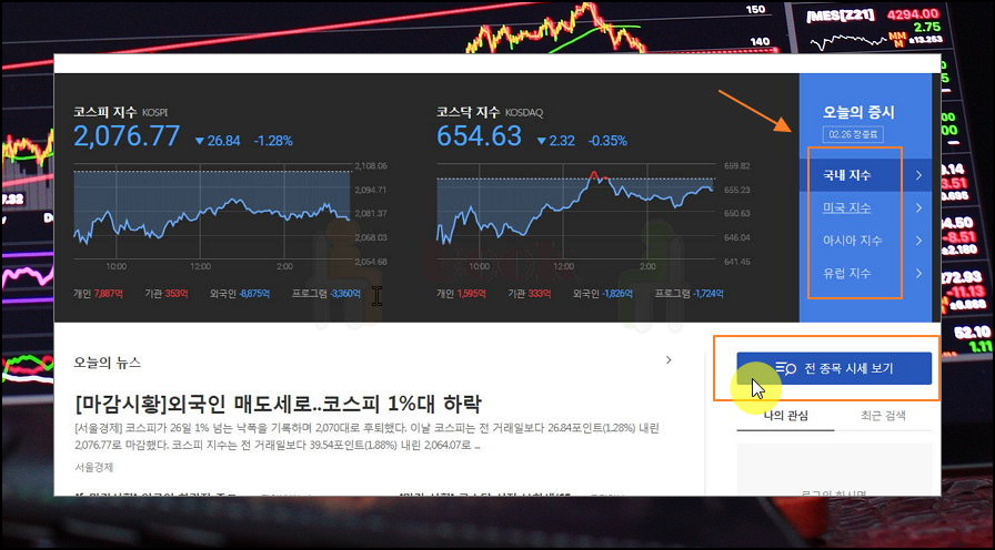 2. 오늘의 증시 동향을 살펴보세요. 홈페이지에 접속해서 가장 먼저 볼 수 있는 것은 오늘의 증시에요. 주식에 관심이 있는 사람이라면 하루를 시작할 때 가장 먼저 보는 것이 있죠. 바로 국내 지수인 코스피와 코스닥에요. 더 나아가 미국, 아시아, 유럽 등의 지수도 함께 조회하는 사람도 많아요. 투자를 하거나 정보를 얻을 때 오늘의 뉴스도 참고하면 좋아요.
