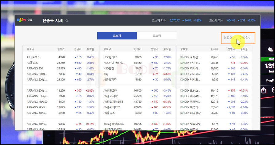 5. 업종별로 주식시세 흐름을 파악해요. 매매를 해보면 아시겠지만, 같은 업종의 주식시세에 대한 흐름이 비슷한 양상을 띠는 경향이 있다는 것을 알 수 있어요. 그런 의미에소 업종명순을 클릭해보세요. 그럼 건설업, 금융업, 기계업 등으로 묶어서 시세조회를 할 수 있어요. 이렇게 보면 어떤 업종이 흥하고 있는지 알기 편해요.