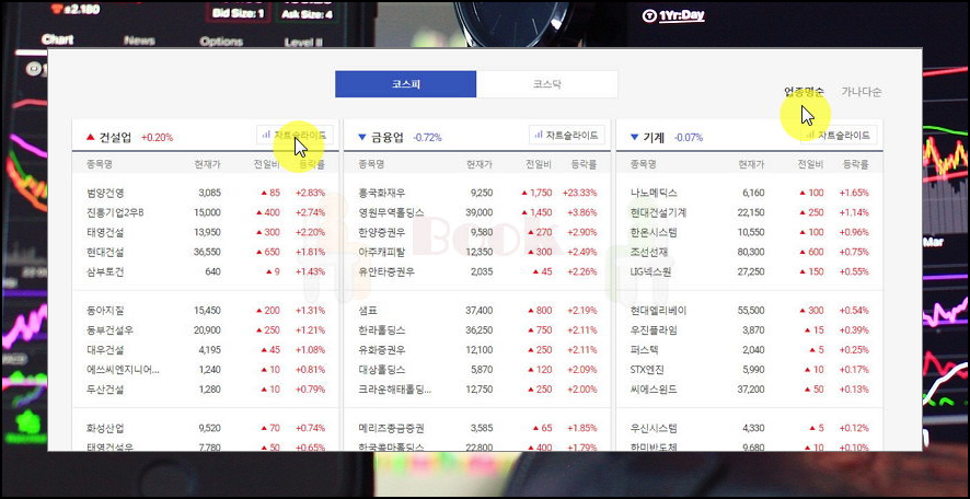 6. 실시간 차트로 종목을 분석해요. 해당 리스트에서 차트슬라이드 버튼을 눌러 보세요. 그럼 해당 업종에 속한 모든 종목의 주식시세를 개별적으로 조회할 수 있어요. 일정 시간을 간격으로 종목을 바꾸어 여러 지표와 그래프, 관련 뉴스를 보여주기 보여주기 때문에 정보 얻기에 편리해요.