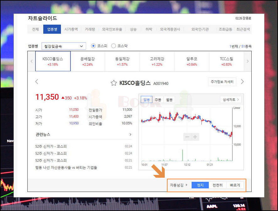 6. 실시간 차트로 종목을 분석해요. 해당 리스트에서 차트슬라이드 버튼을 눌러 보세요. 그럼 해당 업종에 속한 모든 종목의 주식시세를 개별적으로 조회할 수 있어요. 일정 시간을 간격으로 종목을 바꾸어 여러 지표와 그래프, 관련 뉴스를 보여주기 보여주기 때문에 정보 얻기에 편리해요.