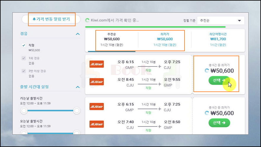 비행기표를 찾아보면 알지만, 국내인데도 불구하고 가격이 싸지 않다고 생각될 때가 많아요. 그래서 비행기표를 싸게 구입하는 방법을 알려드리려고 하는데요. 아무래도 최저가로 검색해주는 사이트를 통해서 구입하시는 게 가장 좋은 방법인 거 같아요. 스카이스캐너와 같은 사이트가 저렴하게 나온 항공권을 구하기가 편한 것 같아요.
