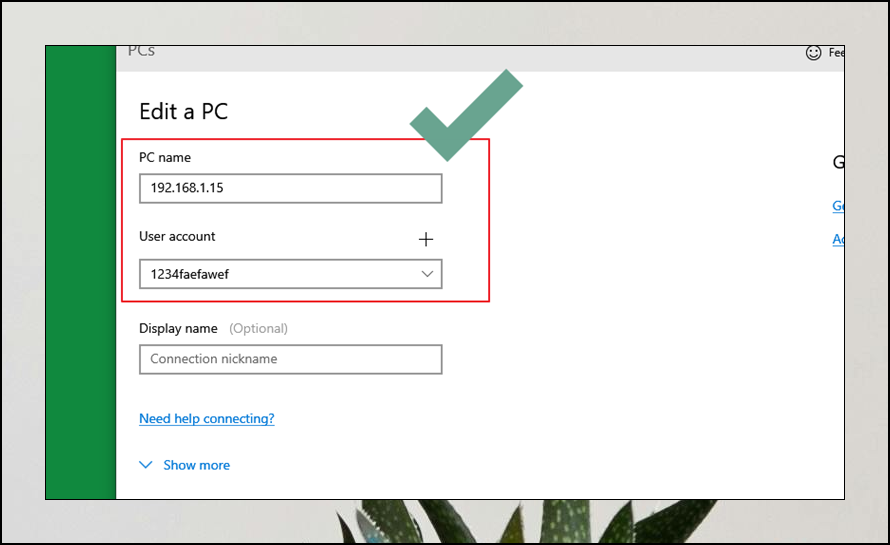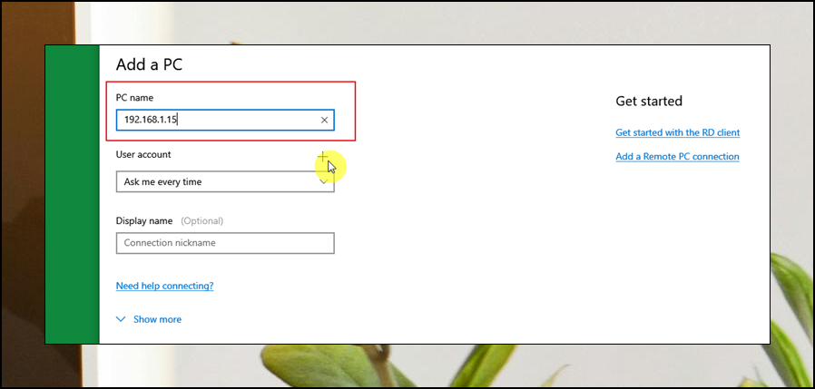 "Add a PC" 창이 열렸어요. 가장 처음에는 접속할 PC의 주소를 입력해 주세요. 내부 연결이 된 경우에는 보통 192.168로 시작할 거에요. 외부에서 접속하고 싶다면 접속 대상이 되는 컴퓨터에서 CMD를 실행한 후 ipconfig 명령어로 ip주소를 확인해야 해요. 그 아이피 주소를 여기 PC name에 넣으면 돼요.