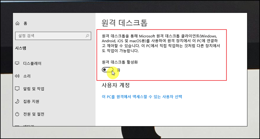 새롭게 열린 창을 보면 "활성화" 버튼이 있어요. 여기에서 끔으로 되어 있으면 연결이 안돼요. 해당 컴퓨터에서 직접 작업하는 것처럼 다른 장치에서 작업을 할 수 있도록 원격 데스크톱 활성화를 켜주세요.