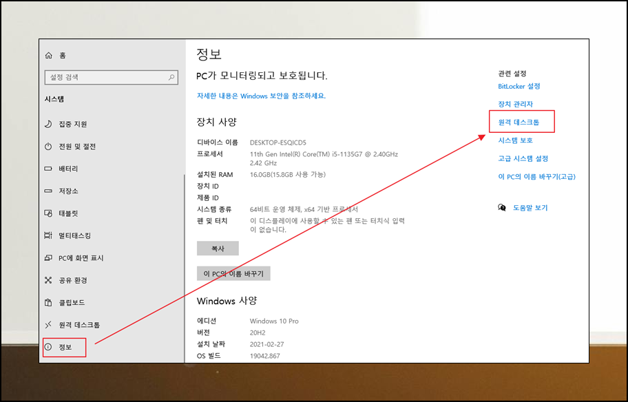 시스템 페이지에서 "정보" 메뉴를 선택해 주세요. 그럼 윈도우과 PC 사양을 확인할 수 있는데요. 바로 오른편을 보면 관련 설정이 있어요. 여기에서 원격 데스크톱을 클릭해 주세요.