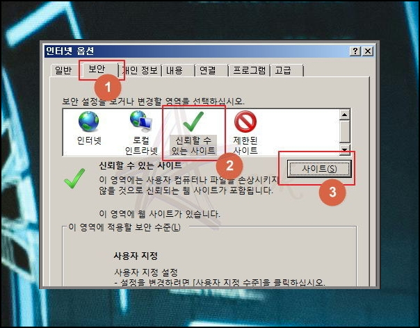보안탭에서 신뢰할 수 있는 사이트를 선택한 후 사이트 버튼을 클릭하면 되는데요. 일반적으로 보안 프로그램 설치를 요구하는 곳은 공인된 사이트인 곳이 대부분입니다. 신뢰할 수 있다는 말이죠. 혹시 모르니 꼼꼼히 확인한 후 진행하세요.