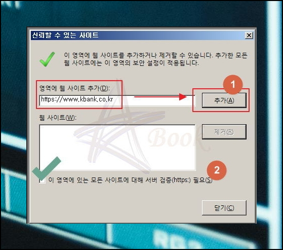 예를 들어 kbank에서 보안 프로그램에 대한 설치가 제대로 진행되지 않을 때 해당 주소를 '영역에 웹 사이트 추가' 란에 입력하시면 됩니다. '서버 검증 필요' 부분에도 체크해주세요. 이 상태에서 다시 해당 사이트에 접속하면 수월하게 진행할 수 있습니다.