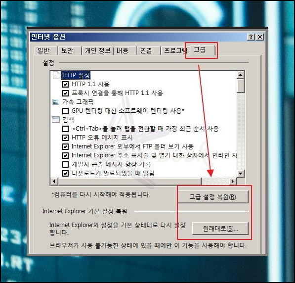 앞서 알려드린 두 가지 방법을 진행했음에도 문제가 생길 때는 마지막 방법을 사용하셔야 합니다. 인터넷 옵션에서 '원래대로' 또는 '고급 설정 복원'을 클릭하시면 되는데요. 기본 설정으로 변하는 것이기 때문에 컴퓨터에 큰 문제를 일으키지 않습니다. 즐겨찾기도 그대로 유지가 되고요.