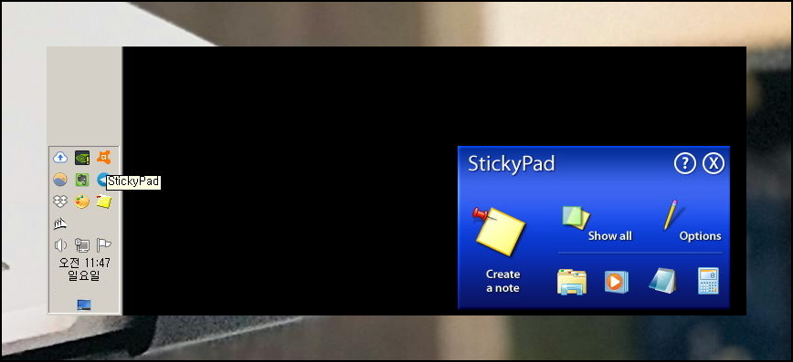프로그램 설치를 완료하시면 윈도우 작업표시줄의 Stickpad 아이콘이 나타날 거예요. 윈도우 우측 하단을 확인하시면 프로그램이 실행되는 것을 보실 수 있습니다. "Create note" 버튼으로 바탕화면에 새로운 포스트잇을 생성할 수 있어요.