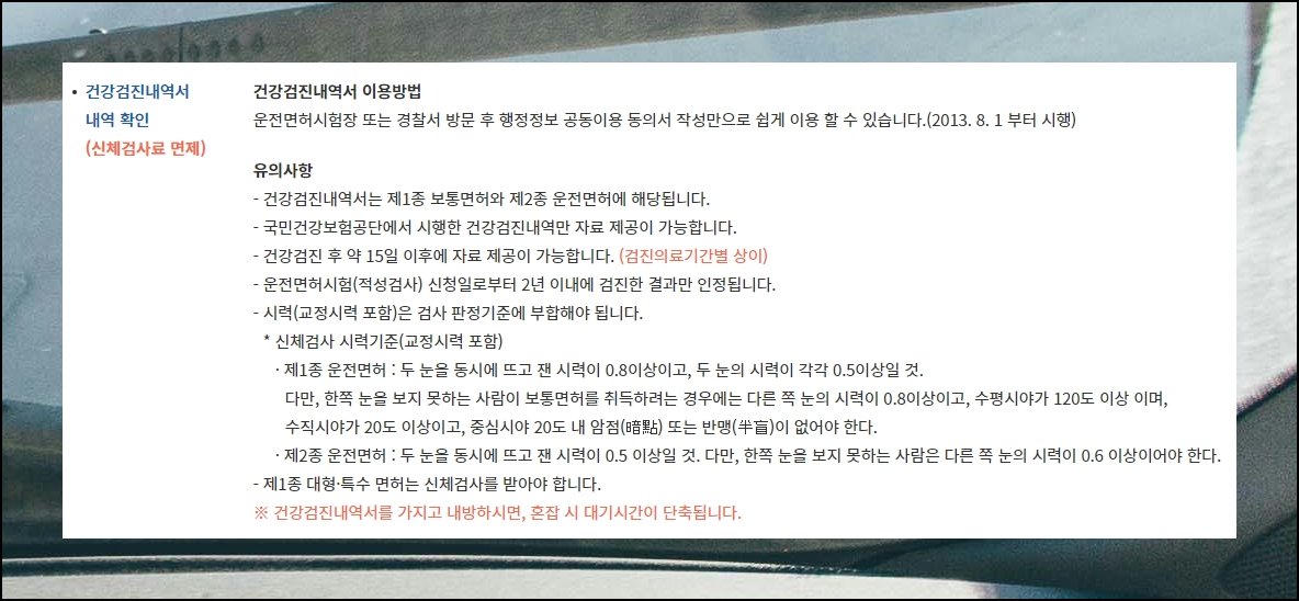 적성검사를 위해 시험장이나 지정병원을 찾기 이전에 어떻게 진행이 되는지 알고 계시는 것이 좋습니다. 우리가 운전을 할 때 필요한 능력에 관련된 것들인데요. 시력, 삼생식별, 청력, 적성기준에 따른 신체장애 여부에 대한 것을 본다고 합니다. 시력기준을 보면 교정시력으로 양쪽 눈이 0.5 이상이어야 한다고 합니다. 안경을 쓰시는 분이라면 교정시력 조건을 충족할 수 있도록 사전에 체크하는 것이 좋겠네요.