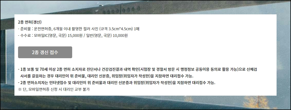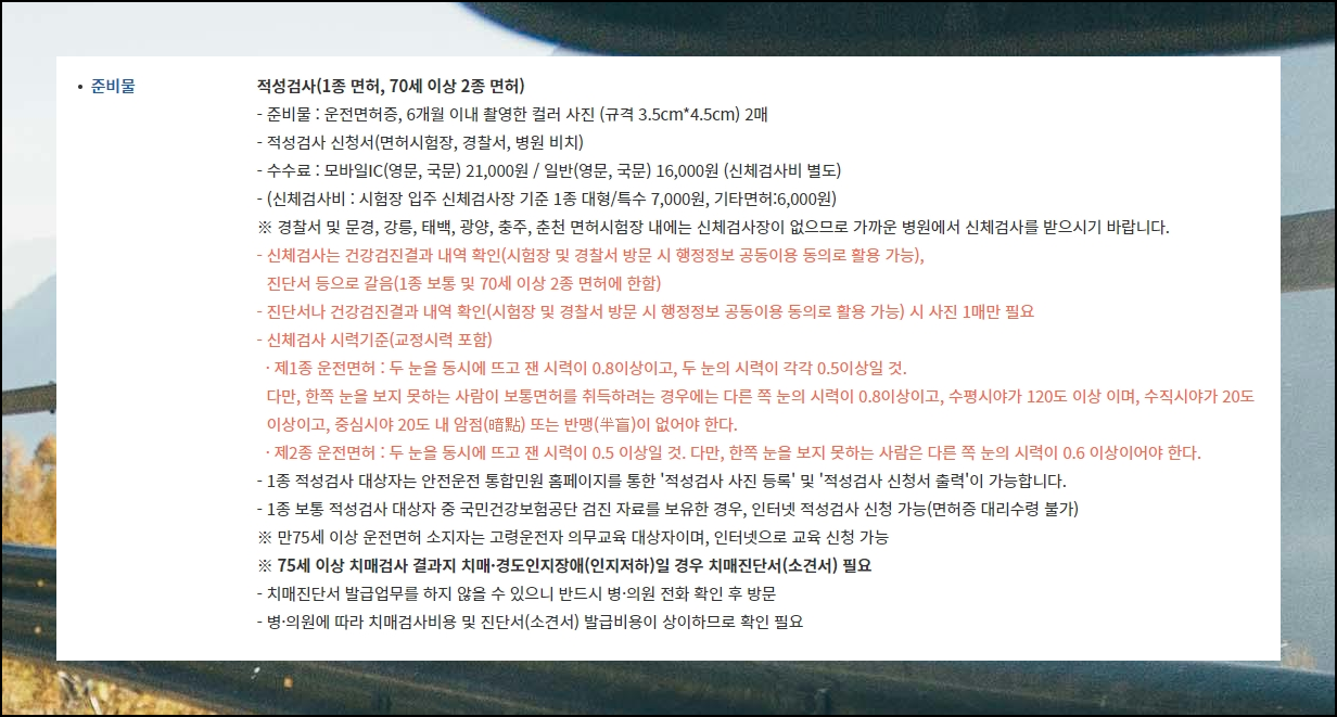 추가적으로 면허갱신에도 해당하는 핵심사항을 알려드릴게요. 운전면허 시험장 또는 경찰서 교통민원실에서 받을 수 있는데요. 70세 이상인 제2종 운전면허 소지자의 경우에는 적성검사 대상자에 해당이 됩니다. 적성검사를 받으러 갈 때에 준비물이 필요한데요. 운전면허증과 6개월 이내 촬영한 컬러사진 2매를 챙기면 됩니다. 신청서의 경우 운전면허 시험장 또는 경찰서, 병원에 비치가 되어 있으니 따로 준비할 것은 없고, 수수료를 꼭 챙기셔야 합니다.