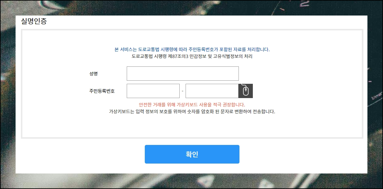 새롭게 창이 열리면서 실명인증을 하라고 나오는데요. 여기에 성명과 주민등록번호를 입력한 후 확인 버튼을 눌러주세요. 제 경우에는 적성검사 기간이 아니기 때문에 더 이상 진행이 안되는데요. 해당 기간을 확인하고 싶다면 면허증을 살펴보면 됩니다.