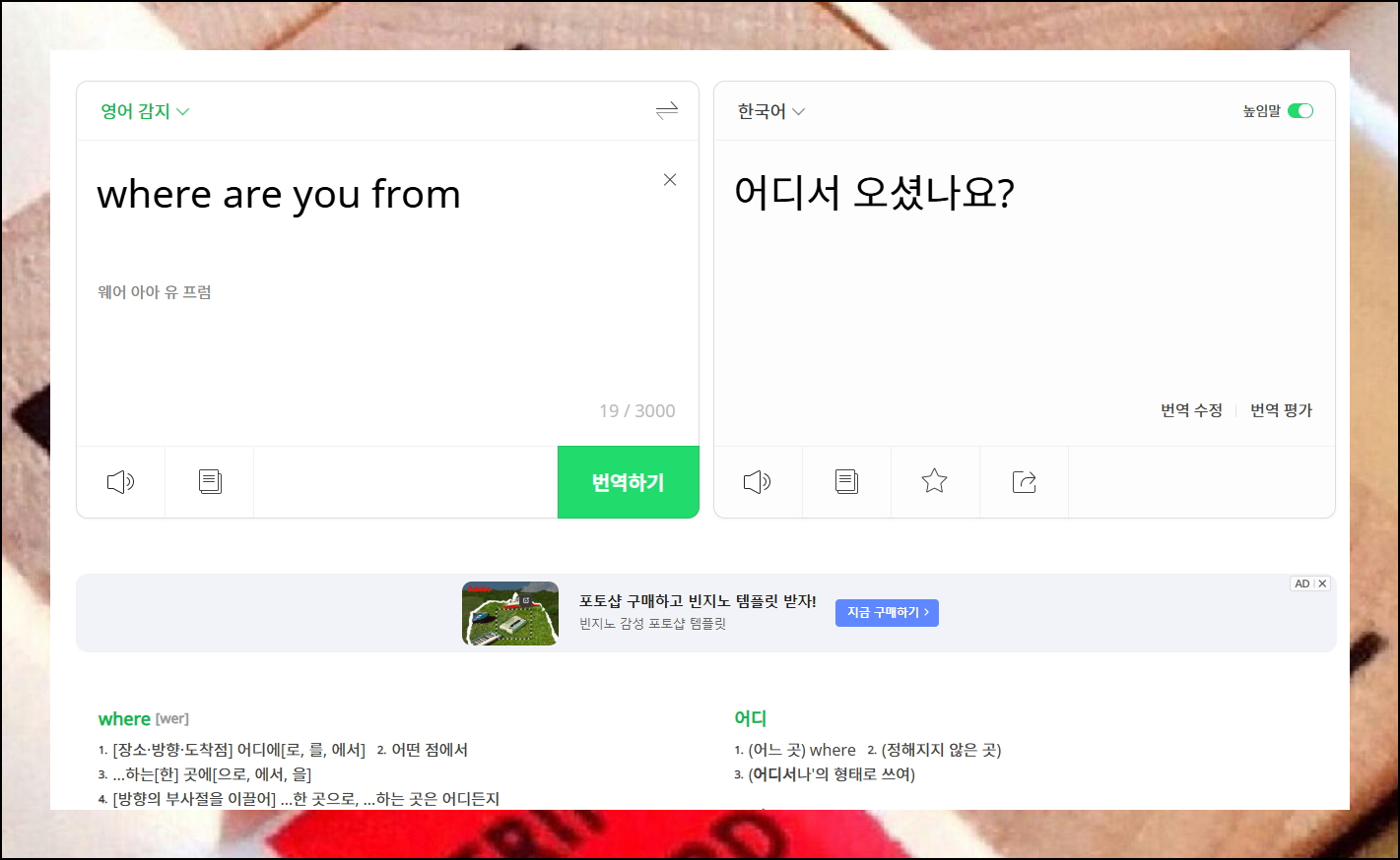 파파고의 사용방법은 매우 직관적이고 간단합니다. 왼쪽 창에 번역하고 싶은 내용을 입력하고 원하는 목표 언어를 선택하면 됩니다. 높임말 번역 기능과 함께 유용한 관련 단어 정보도 제공하니 언어 학습에도 큰 도움이 돼요.