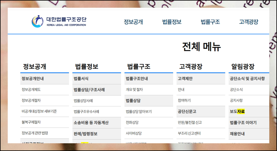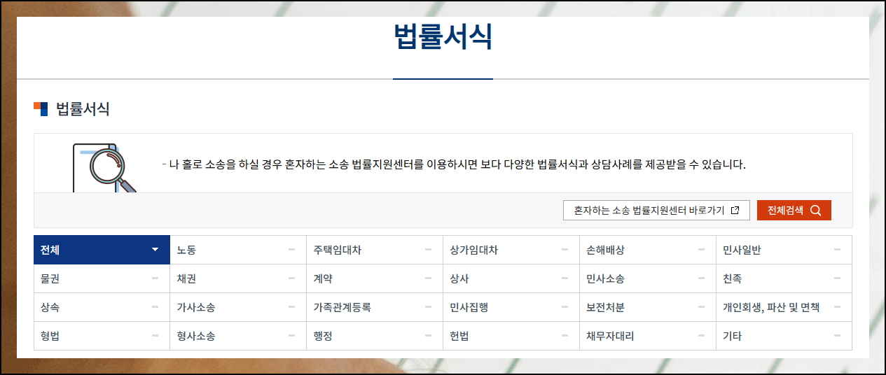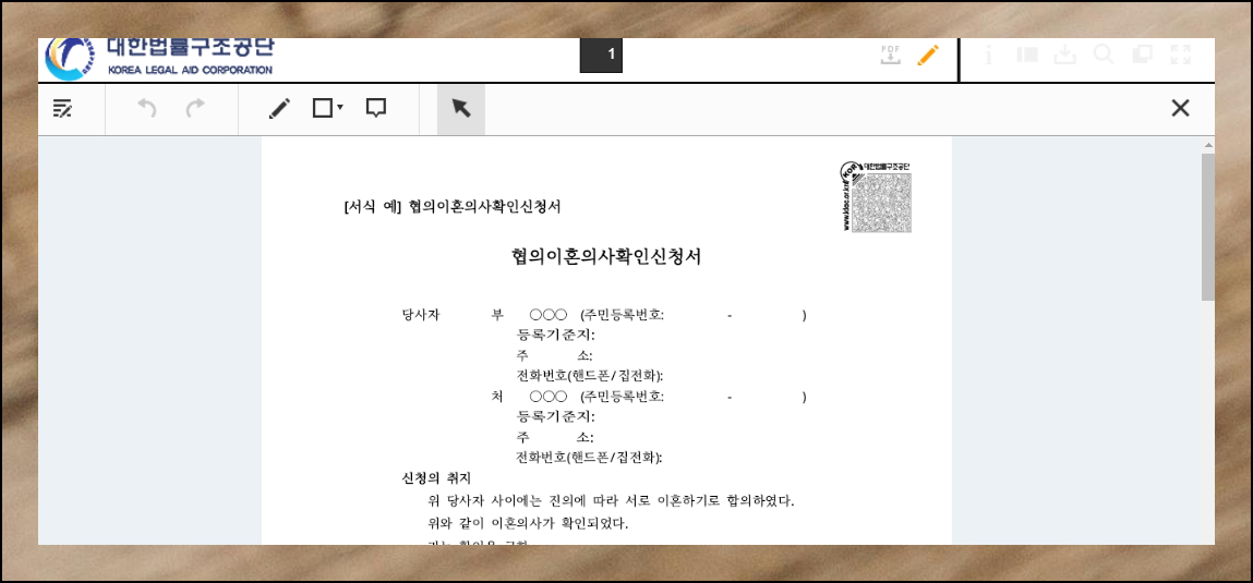 법률구조공단은 법적 고민이 있는 분들의 든든한 지원자예요. 무료 법률상담부터 협의이혼서류 작성까지 원스톱으로 받으실 수 있습니다. 양식 작성이 어려우신 분들은 무료 상담을 이용해보세요. 홈페이지 상단의 법률서식 메뉴를 클릭하시고 법률지원센터로 이동하시면 필요한 모든 서비스를 이용하실 수 있어요.