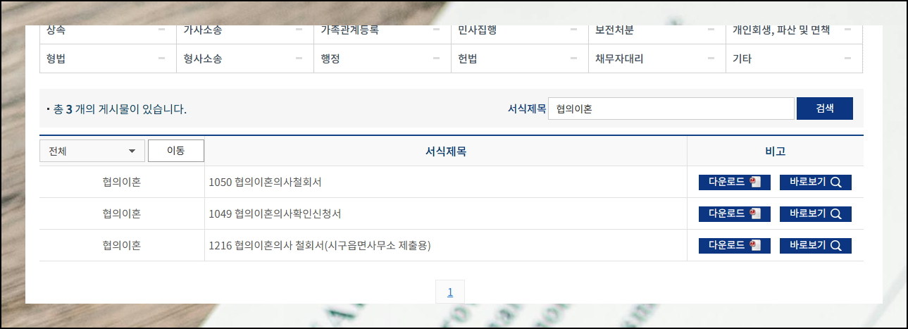 협의이혼서류 양식을 찾는 방법은 매우 간단합니다. 검색창에 협의이혼 의사확인신청서를 입력하시면 바로 결과가 나와요. 양식 미리보기로 내용을 확인하신 후, 무료로 한글파일을 다운받아 작성하거나 온라인에서 바로 작성하실 수 있습니다. 협의이혼서류 작성에는 두 가지 방법이 있으니 편하신 걸로 선택하시면 되요.