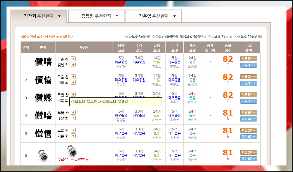 선택한 한글 성명에 대해 각각 5개의 한자를 추천 받을 수 있습니다. 성명학적 이론과 의미를 고려하여 선별이 된 한자들이에요. 아기의 사주에 맞는 이름 짓기를 위해 음양조화나 수리오행 등 다양한 기준으로 평가된 종합 점수를 참고하시면 됩니다.