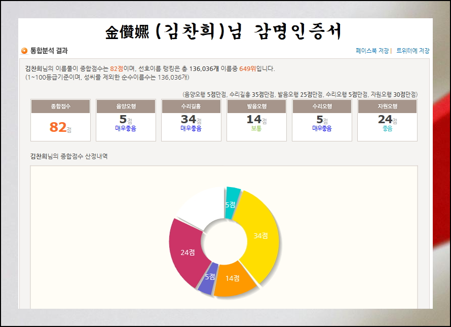 마음에 드는 한자를 선택하면 무료로 작명 결과를 감명인증서로 받아볼 수 있어요. SNS를 통해 저장하고 공유할 수 있습니다. 아기의 이름 짓기는 가족들과 함께 상의하면서 더 좋은 성명을 찾아보세요. 여러 사람의 의견을 들으며 신중하게 결정하면 좋습니다.