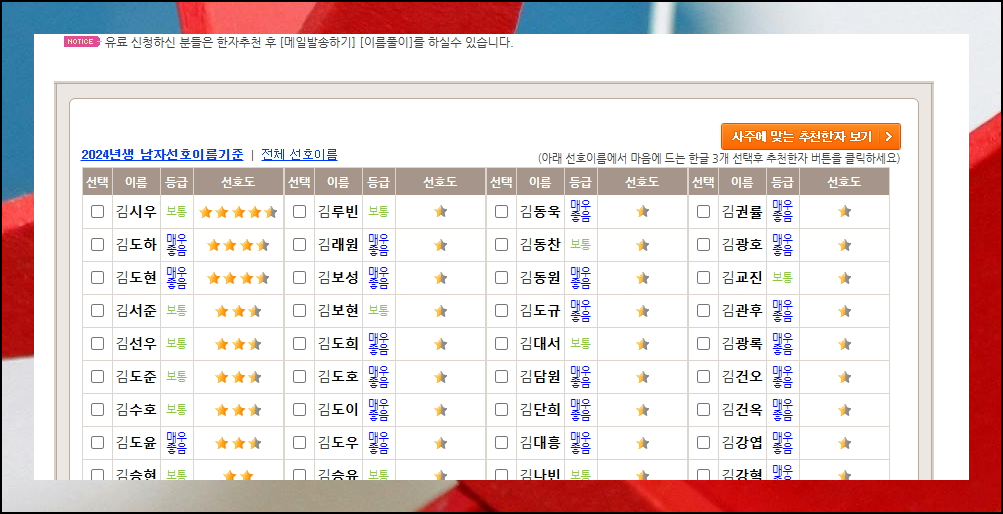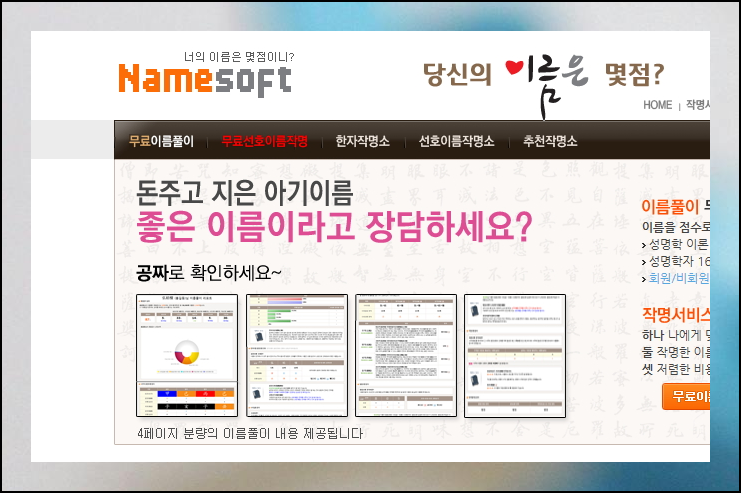 사이트에 들어가면 여러 메뉴가 있습니다. 무료 선호 이름 작명 메뉴를 선택하시면 됩니다. 아기의 이름 짓기 서비스는 메인 화면에서 확인할 수 있어요. 전문가들의 검증을 거친 알고리즘으로 만들어진 무료 서비스입니다.