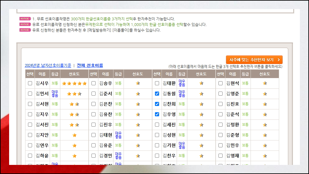 입력한 정보를 바탕으로 300개의 성명을 추천 받을 수 있어요. 등급과 선호도를 참고하여 마음에 드는 성명 3개를 고르면 됩니다. 아기와 잘 어울리는 이름 짓기를 위해 발음이 자연스러운지 그리고 부모님의 마음에 쏙 드는지 알아보세요.