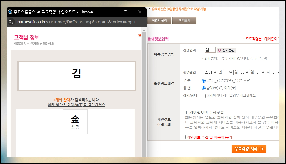 아기의 성별과 성씨, 출생 관련 정보를 입력해야 합니다. 이러한 정보들은 최적화된 성명을 추천 받기 위해 필요해요. 아기의 이름 짓기를 위해 모든 정보를 입력한 후에는 "무료 작명 시작" 버튼을 눌러주세요.