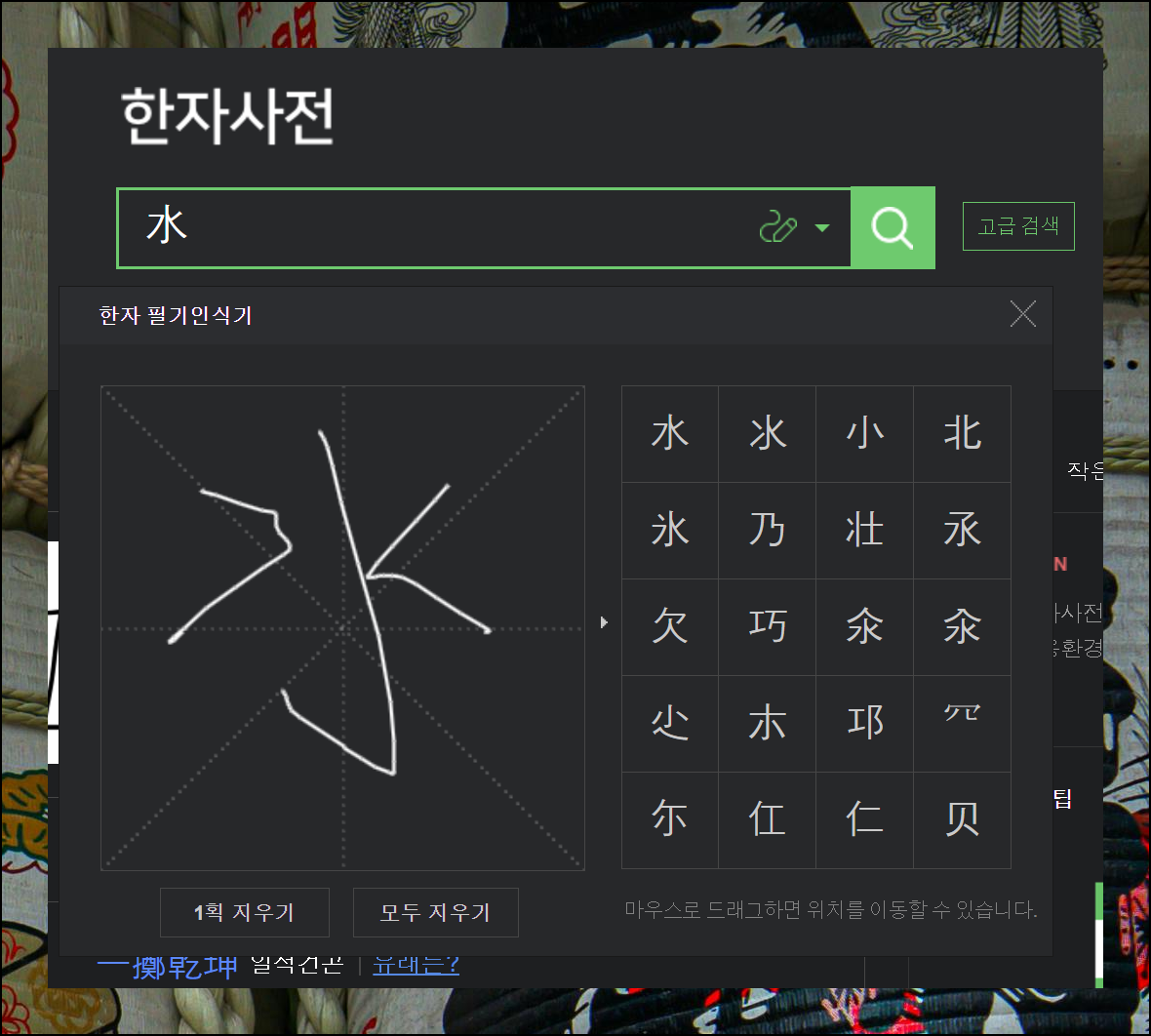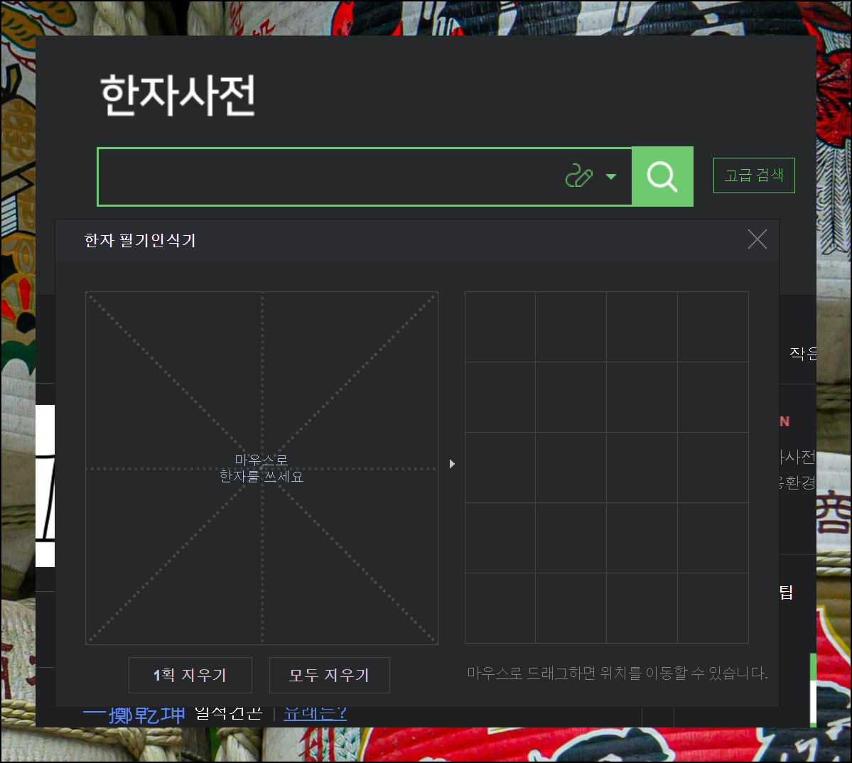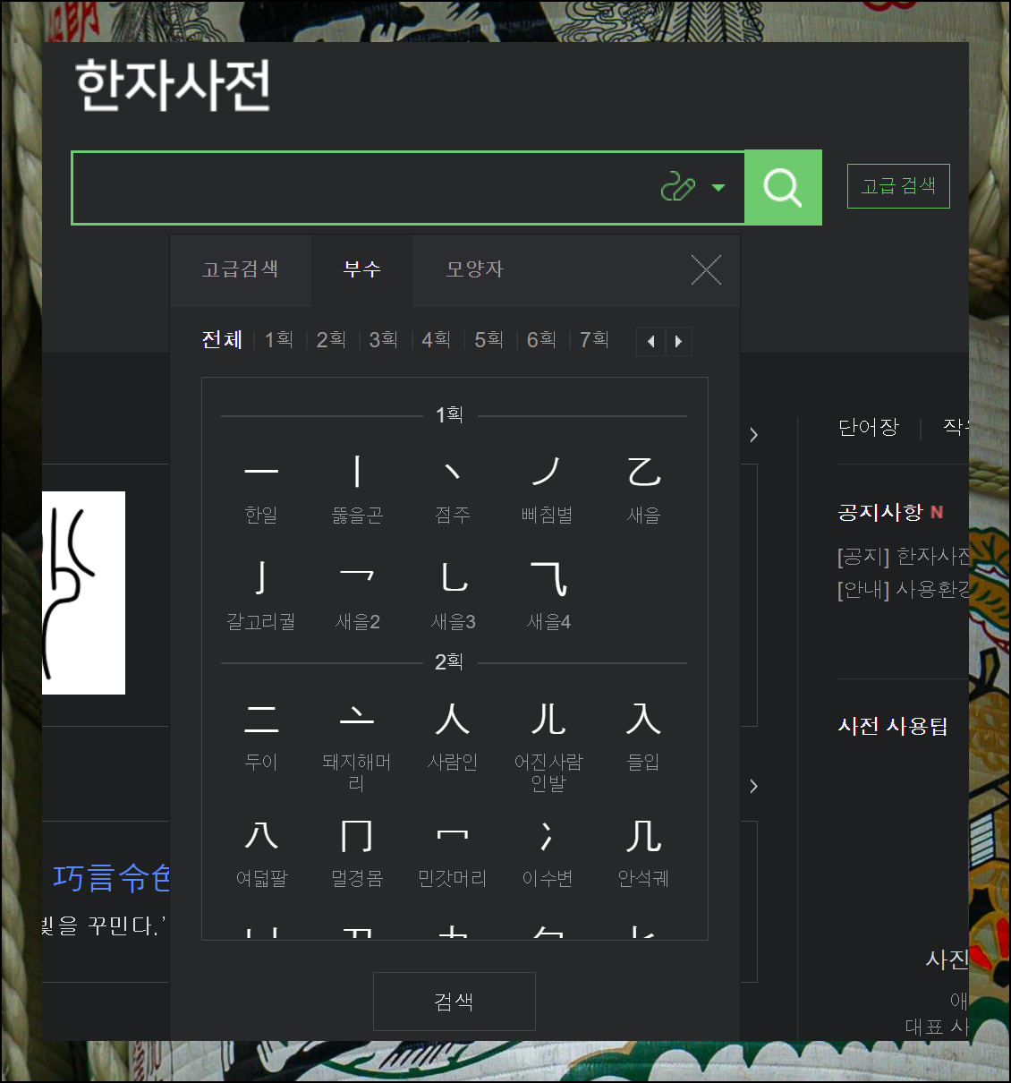 해당 번역기는 그리기 외에도 여러 가지 방법으로 한자를 찾을 수 있습니다. 특히 옥편 사용에 익숙한 분들을 위한 옥편식 검색 기능도 마련되어 있어요.