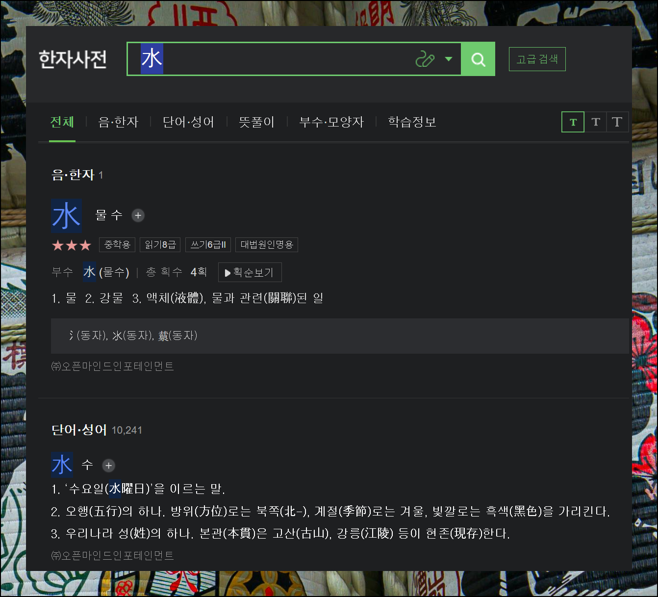 검색 결과에서는 음과 뜻 뿐만 아니라 관련 단어, 고사성어, 부수 등 풍부한 정보를 확인할 수 있어요. 특히 한문 번역기에서 원하는 글자를 클릭하면 더욱 상세한 내용을 볼 수 있습니다.