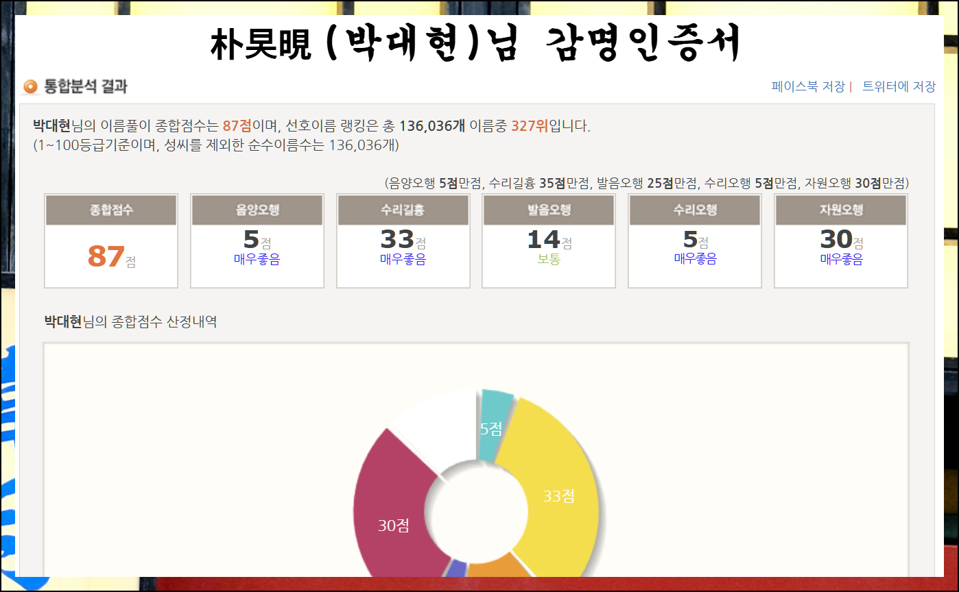 인터넷 작명소의 감명인증서는 사이트에서 바로 확인 가능하며 SNS에도 저장할 수 있습니다. 우리가 얻은 성명에 대한 종합점수와 선호도 랭킹, 그리고 점수 산정 내역까지 모두 확인할 수 있으니 참고하시기 바랍니다. 작명소의 전문적인 분석 결과를 한눈에 볼 수 있어요.
