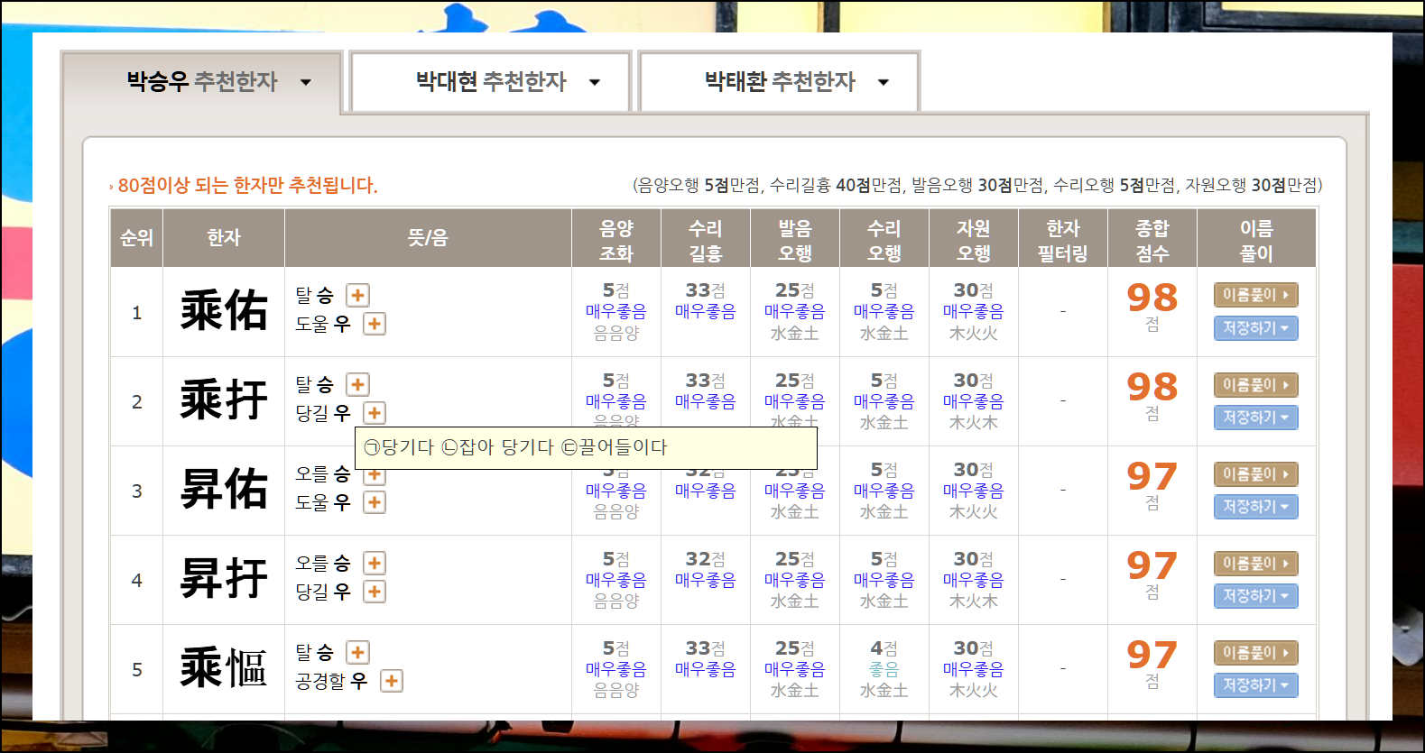 예를 들어 "승우"라는 이름을 선택하면 5개의 한자 조합을 얻을 수 있어요. 성명학적 분석 결과와 한자의 의미를 고려하여 좋은 것을 고르시면 됩니다. 각 한자 옆에 있는 이름풀이 버튼을 통해 감명인증서도 발급 받을 수 있어요. 무료로 제공되는 서비스를 충분히 활용해보세요.