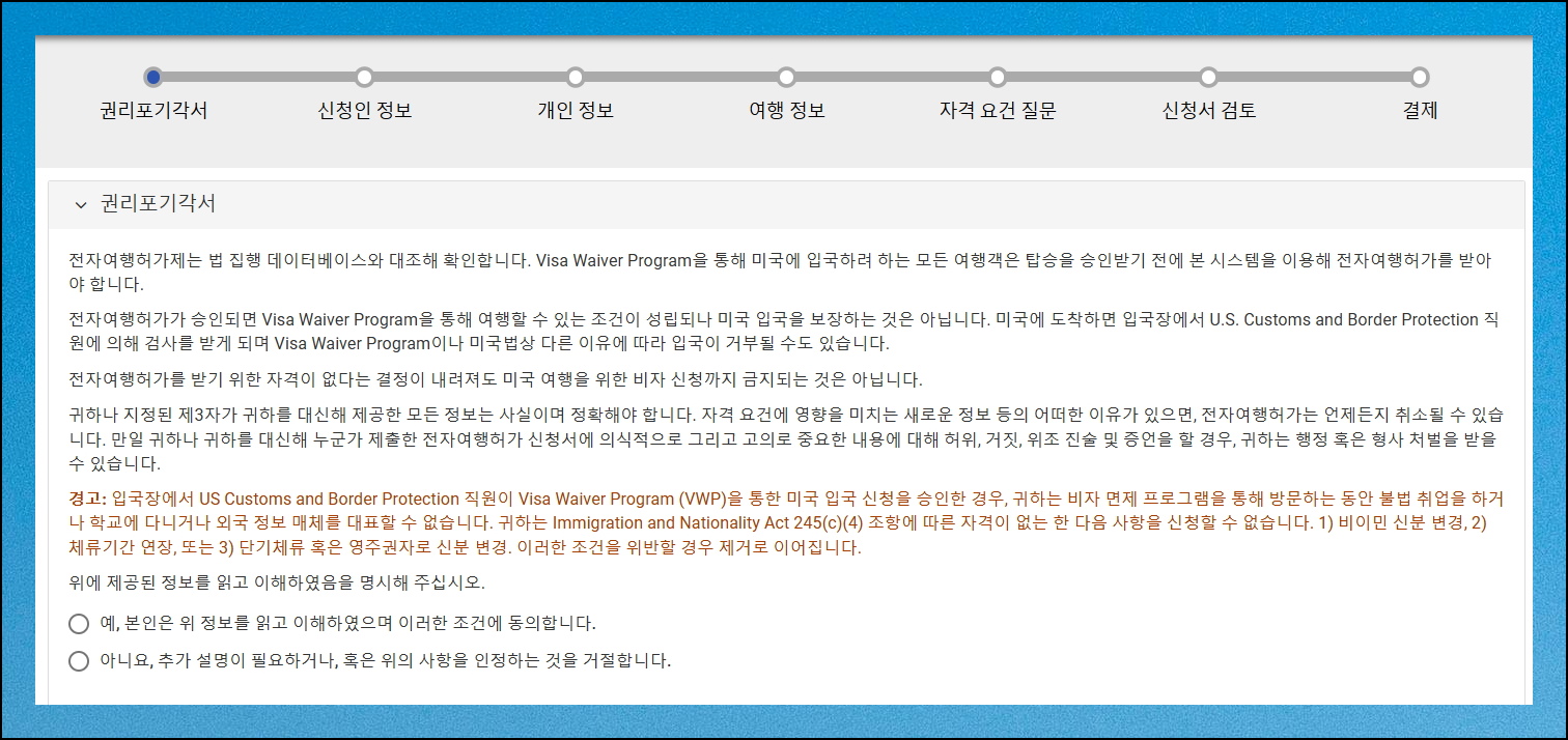 ESTA 신청은 총 7단계로 구성되어 있습니다. 각서 동의부터 수수료 결제까지, 모든 단계가 상세하게 안내되어 있어요. 차근차근 읽어보면 진행하시면 어렵지 않습니다. 이는 비자를 대체하는 가장 효율적인 방법이에요.