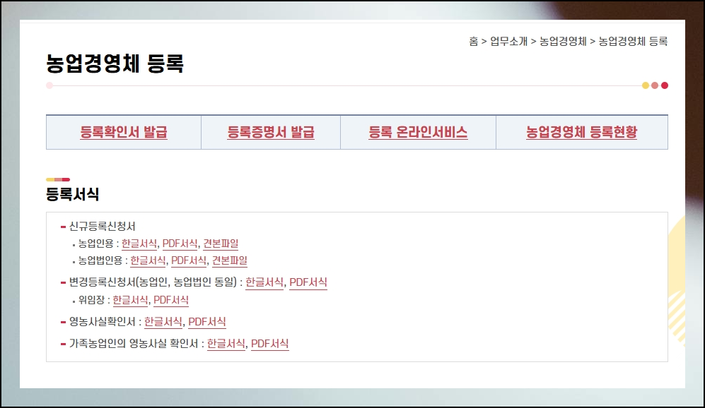 농업경영체 등록 페이지에서는 필요한 모든 서류와 안내사항을 찾아보실 수 있습니다. 신청서 양식과 상세한 절차가 제공되며, 온라인 등록도 가능해요.