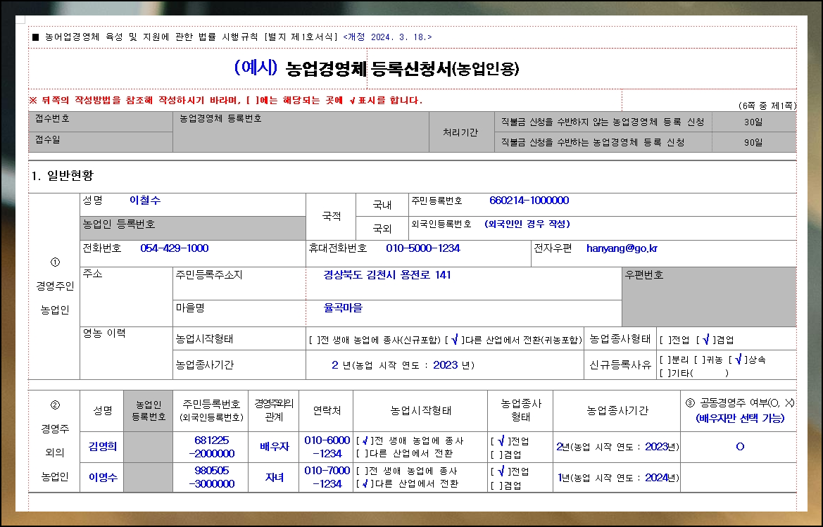 신청서 작성이 어려우시다면 견본 파일을 참고하세요. 예시를 통해 각 항목별 작성 방법을 쉽게 이해하실 수 있습니다. 예시를 기준으로 본인의 정보를 채워넣으시면 되며, 농업경영체 등록 절차도 함께 확인해보세요.