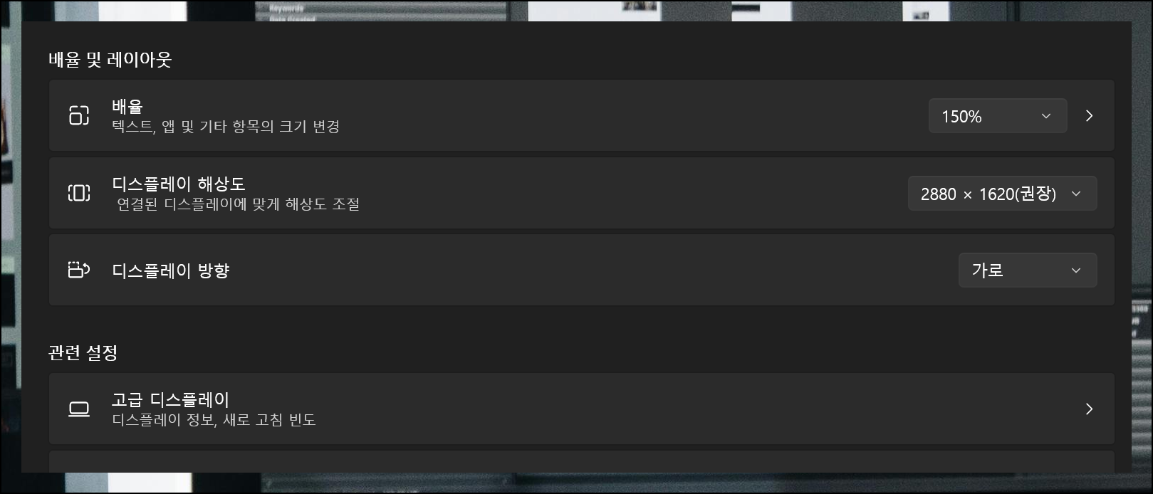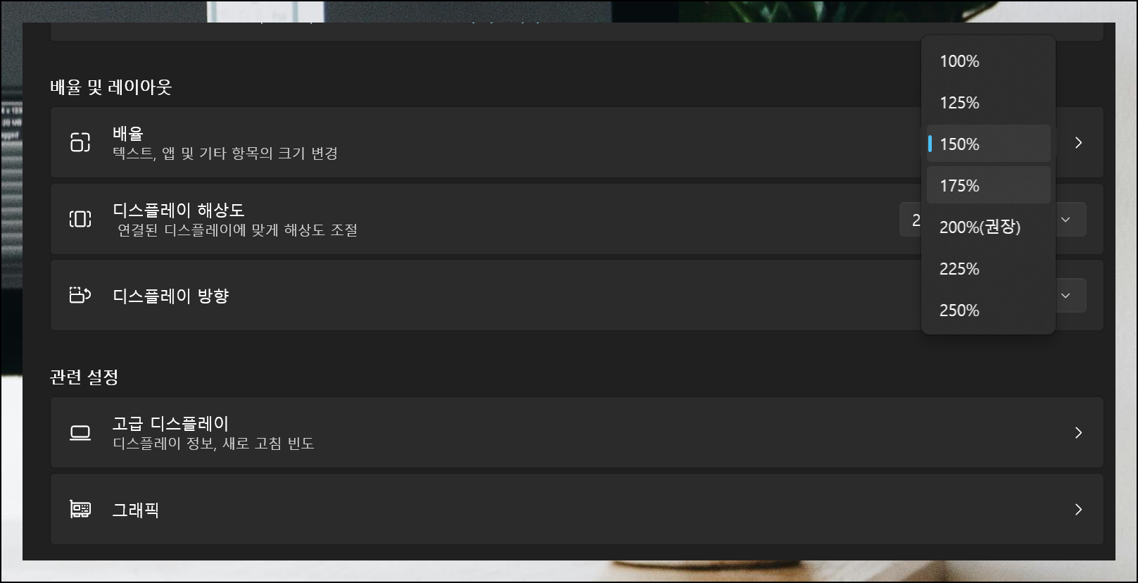 글자나 아이콘이 너무 크거나 작지는 않나요? 데스크톱에서는 보통 100% 크기로 설정하지만, 4K 화면에서는 150%도 많이 사용해요. 노트북은 화면이 작아서 더 큰 배율을 쓰는데, 15인치는 110~120%, 13인치는 150% 정도가 보기 편합니다. 자신에게 맞는 크기를 찾아 조절하세요.