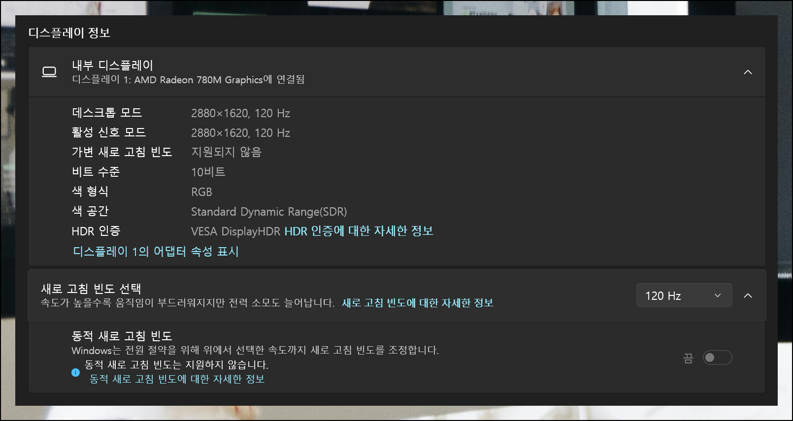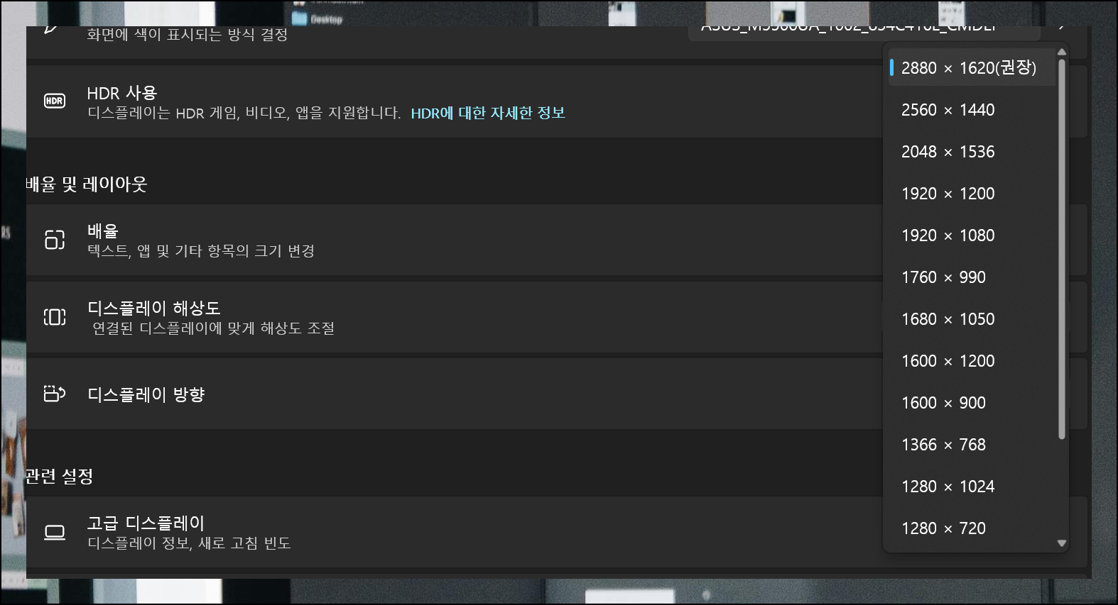 고급 디스플레이 설정에서는 더욱 자세한 화면 옵션들을 확인할 수 있어요. 추가 설정을 통해 더 섬세한 조절이 가능합니다. 각자의 환경에 맞춰 세밀하게 조정해보세요.