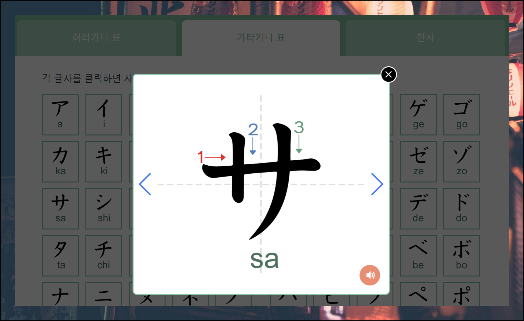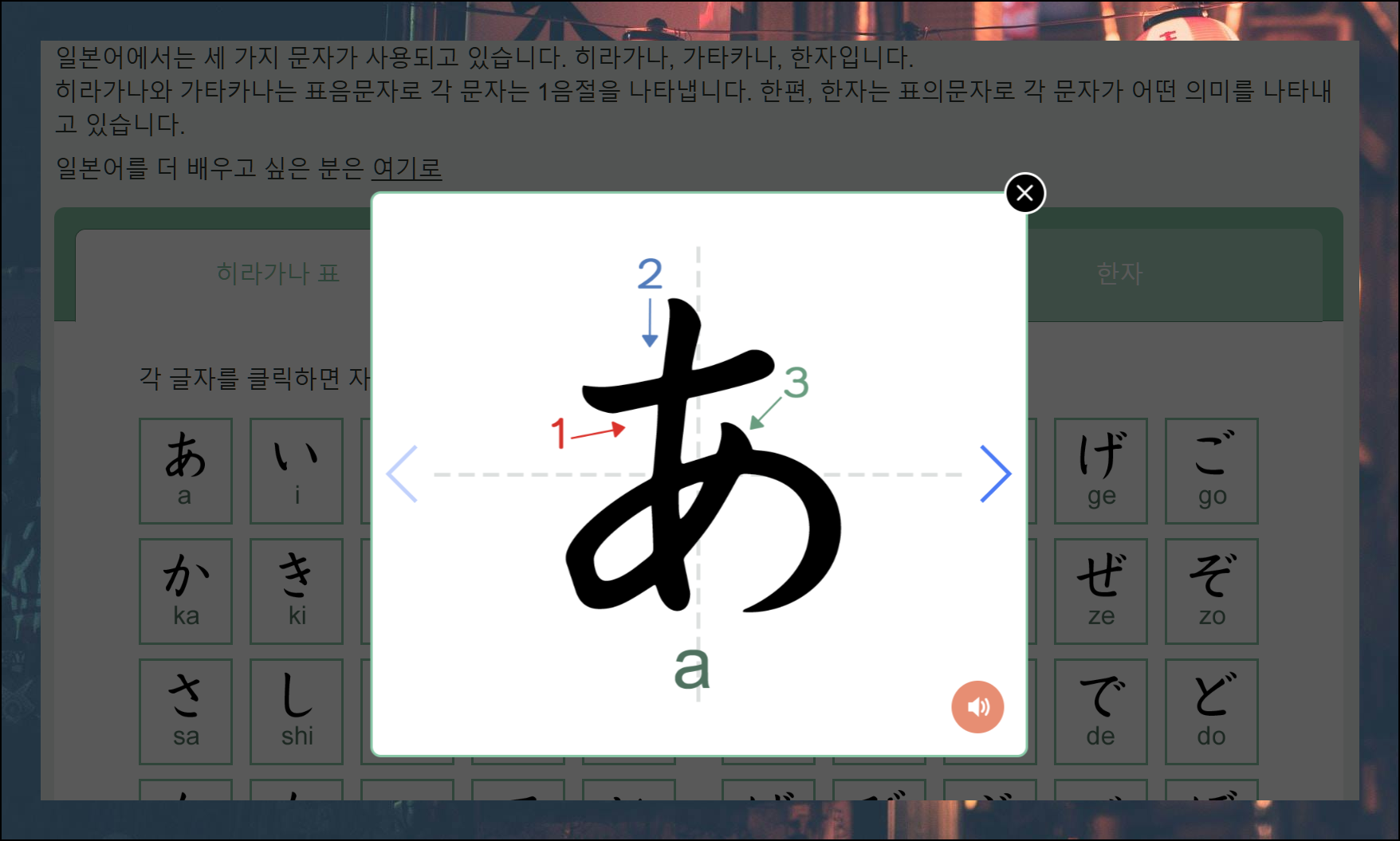 일본어 표에서 문자를 선택하면 확대된 화면으로 자세히 볼 수 있어요. 획순이 표시되어 있어 따라 쓰기가 쉽고, 스피커 아이콘으로 정확한 발음도 들을 수 있습니다.
