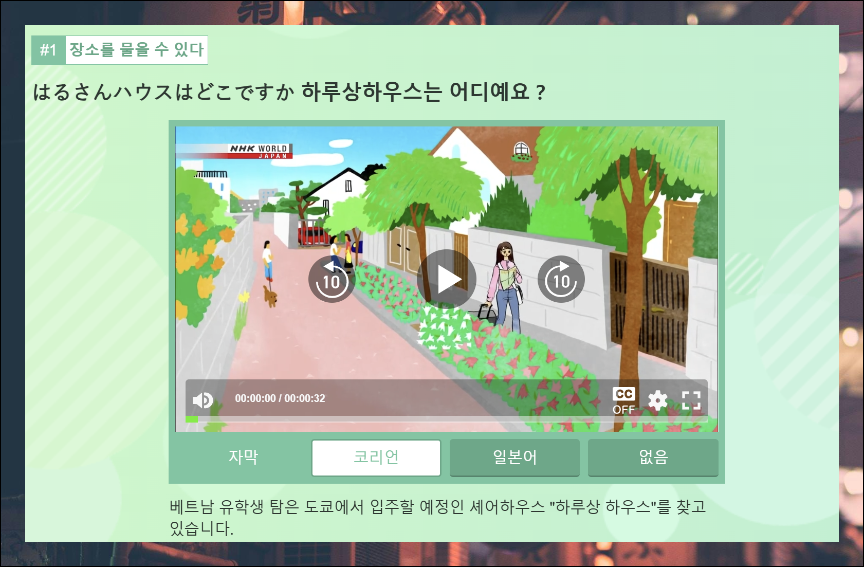 영상 아래에는 일본어, 영어, 한국어로 된 대화 스크립트가 있어요. 음성 듣기도 가능해서 히라가나 학습에 매우 효과적입니다.