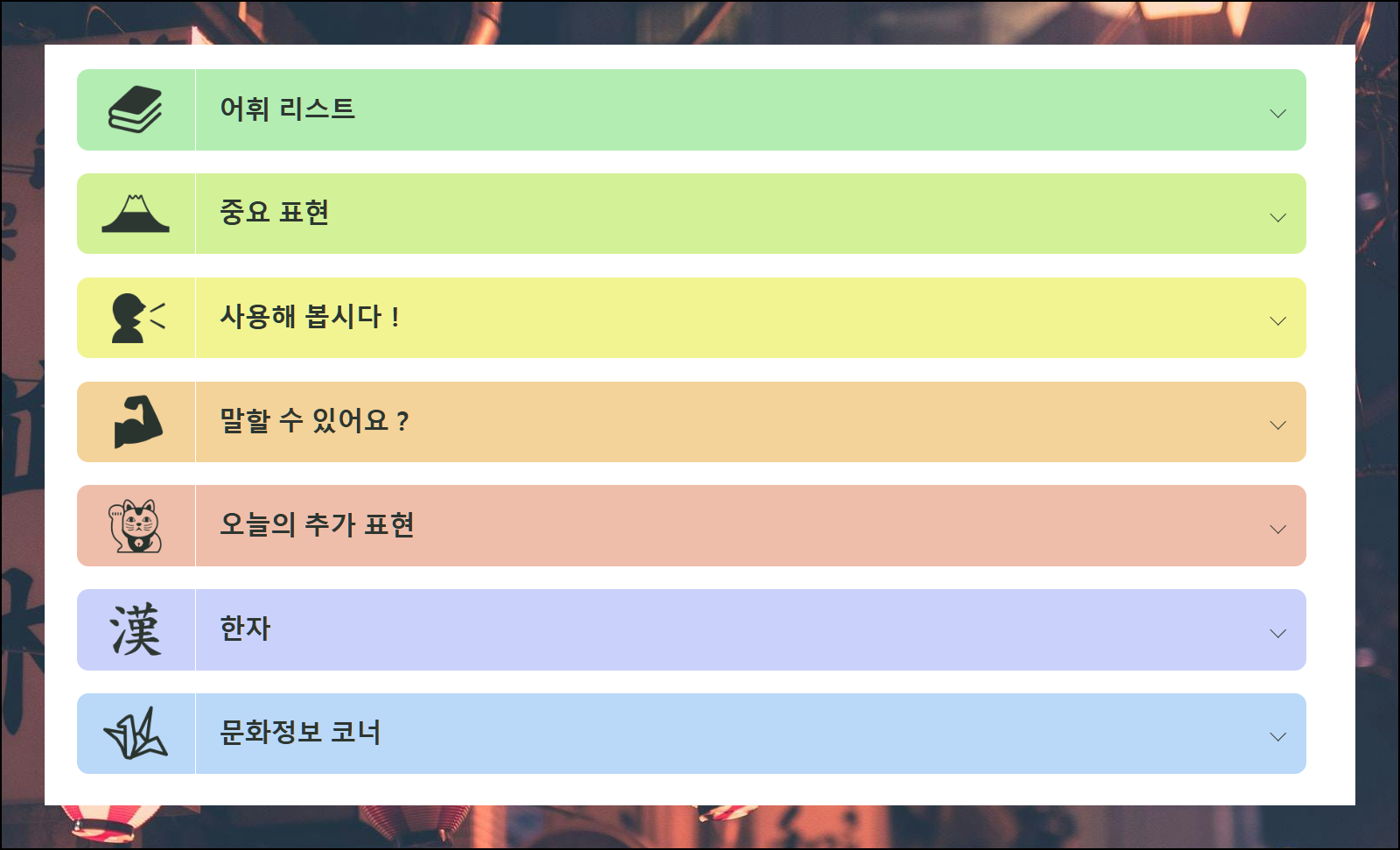 중요 표현, 한자, 문화 정보 등 다양한 콘텐츠가 준비되어 있어요. 기본 회화부터 심화 학습까지 단계별로 진행할 수 있답니다.