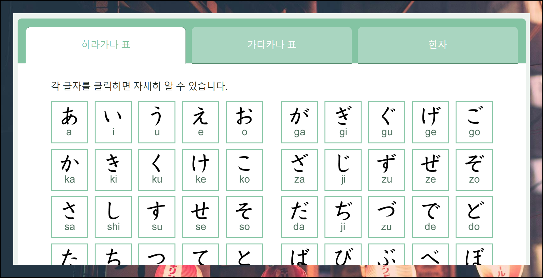 사이트에서 레슨과 자료를 클릭하면 일본어 표를 쉽게 찾을 수 있습니다. 히라가나와 가타카나 중 원하는 항목을 골라 학습을 시작해보세요.