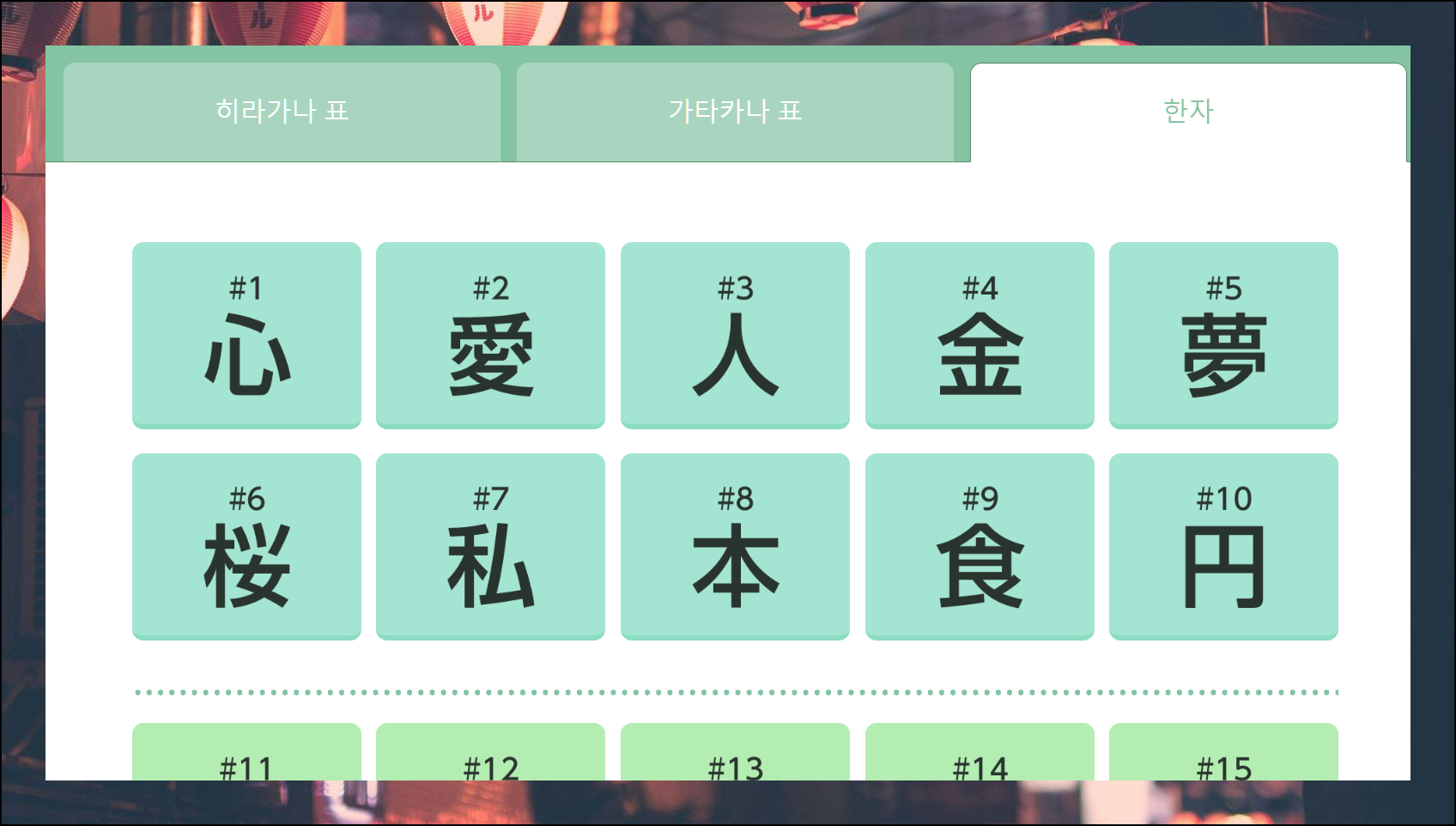 일본어의 또 다른 기둥인 한자도 체계적인 표로 정리되어 있습니다. 각각의 한자는 고유한 의미를 담고 있는 특별한 문자예요.